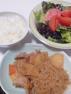 お疲れ様です🍀 今週肉じゃが作ってみた😄 久しぶりに作ってみたが上手く行った😄 料理はするが基本野菜不足になってるから 今回はサラダも一緒に添えてみた😁 野菜不足だからたくさん食べないとね😋 それではまた